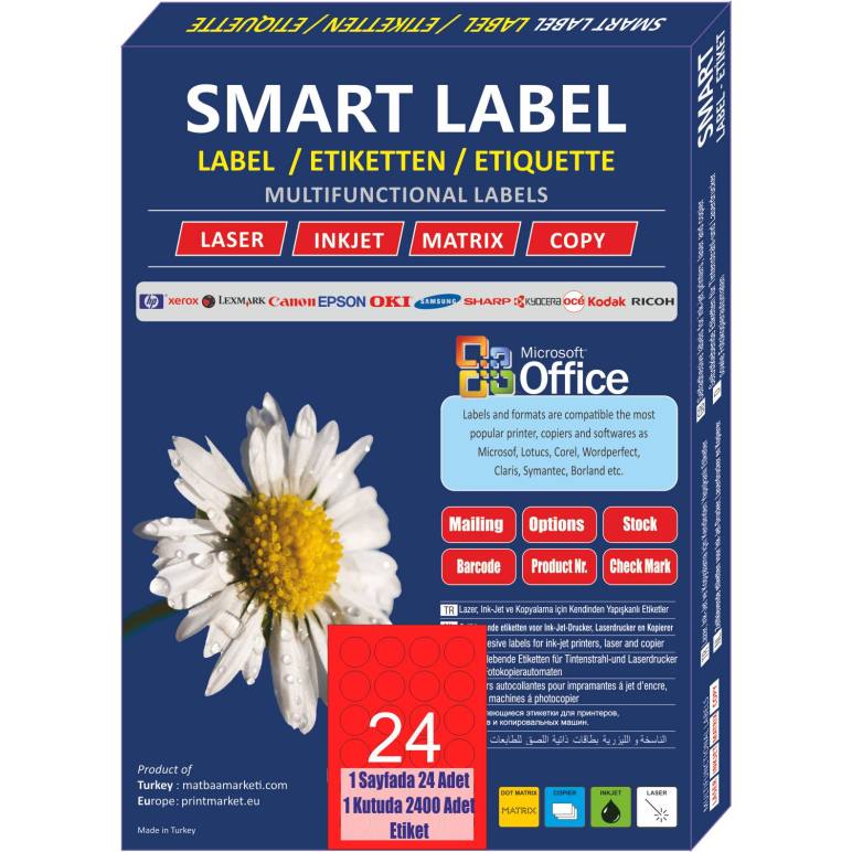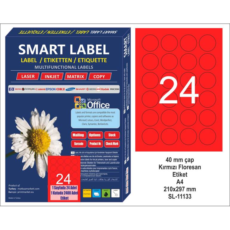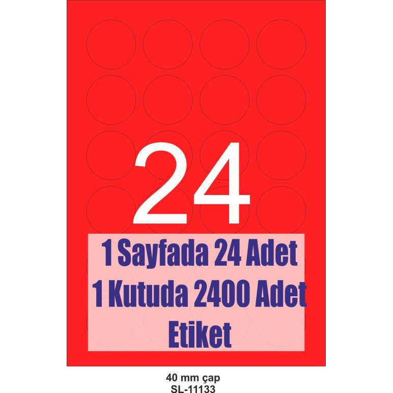 Her tabakada 24 adet 40 mm çapında yuvarlak etiket.