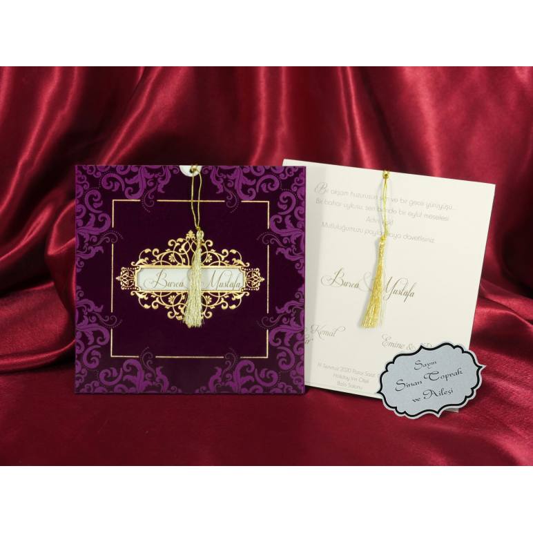 Mor Kadife Kabartma Desenli, Püsküllü Davetiye18x18 Cm Ebatında