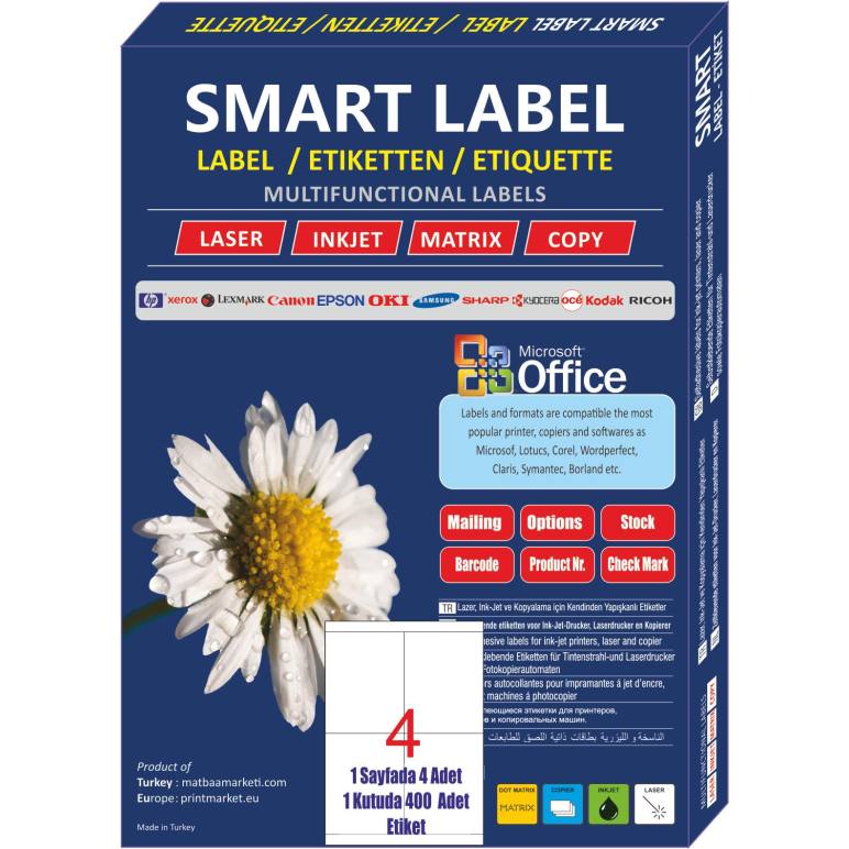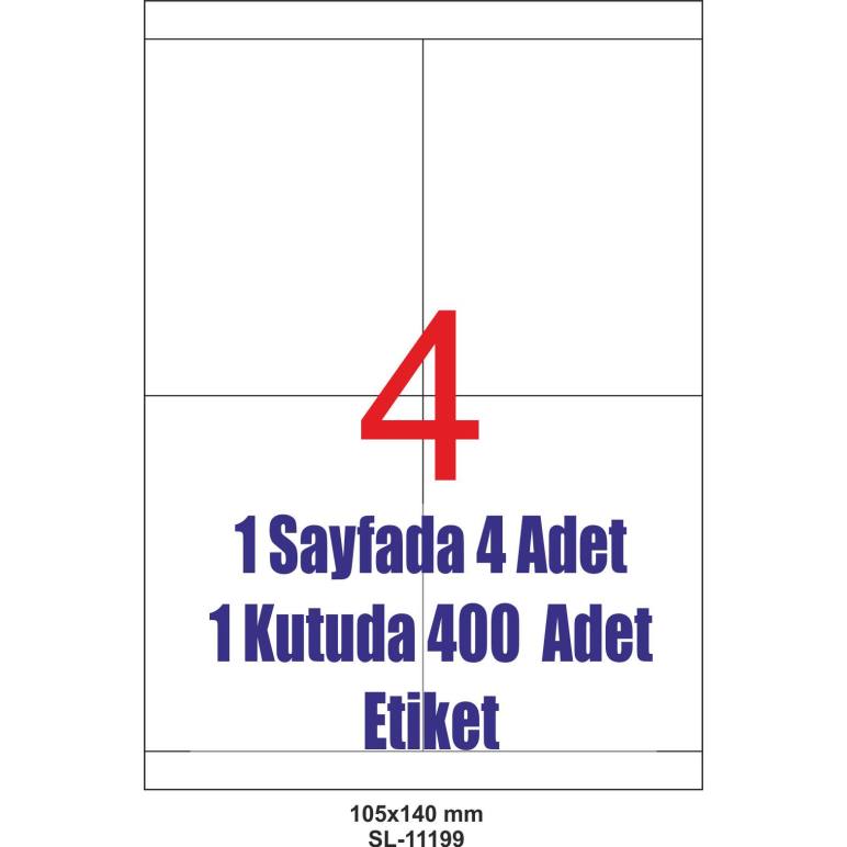 Bir tabakada 4, bir pakette 400 adet etiket bulunmaktadır.Lazer, Inkjet, Matrix ve Kopyalama sistemlerinde rahatlıkla kullanabilirsiniz.